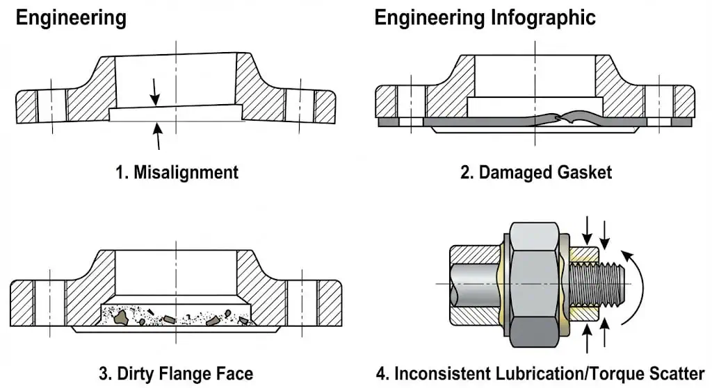 - تحقق من محاذاة الفلنجة (متوازية ومركزية). سوء المحاذاة يستهلك حمل البرغي ويقلل إجهاد الحشية.