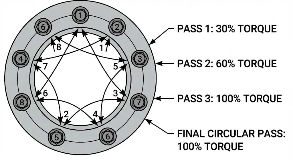 - استخدم طريقة شد مضبوطة: شد أولي خفيف، ثم عزم 30%/60%/100% بنمط نجمة؛ ثم تمريرة دورانية نهائية حول الفلنجة.