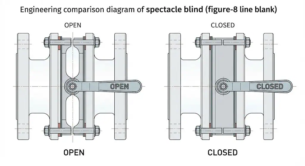 الفلنجة العمياء هي عادةً غطاء نهاية (لوح صلب، بدون تجويف) يتم تثبيته بمسمار إلى نهاية أنبوب أو فوهة. الفلنجة العمياء ذات الشكل الثماني هي غطاء خط تشغيلي يتم تركيبها بين فلنجتين، مما يسمح للمشغلين بالتبديل بين وضع “مفتوح” (فاصل) و“مغلق” (غطاء) مع تأكيد مرئي واضح. عمليًا، الخيار الأكثر أمانًا هو الذي يتطابق مع فلسفة العزل الخاصة بك (عزل إيجابي مقابل غطاء نهاية)، وتكرار الصيانة، وقيود الضغط–درجة الحرارة والتثبيت/الشد للمفصل.