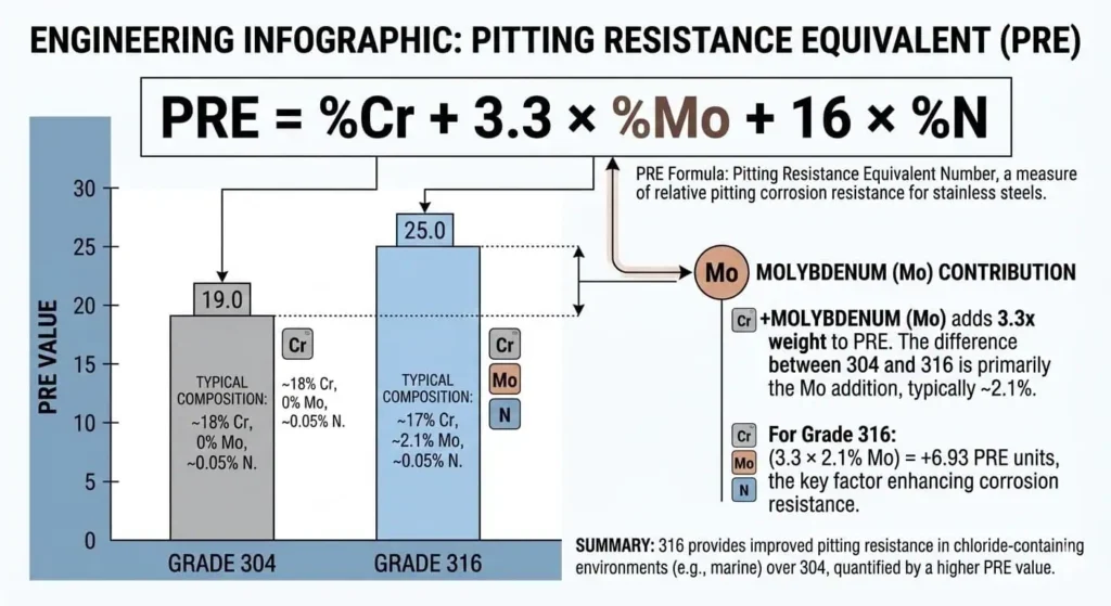 | PRE / Pitting Resistance Indicator (engineering shortcut) | Lower PRE range (often ~18–22 class for 304-type) | Higher PRE range (often ~24–26 class for 316-type) |