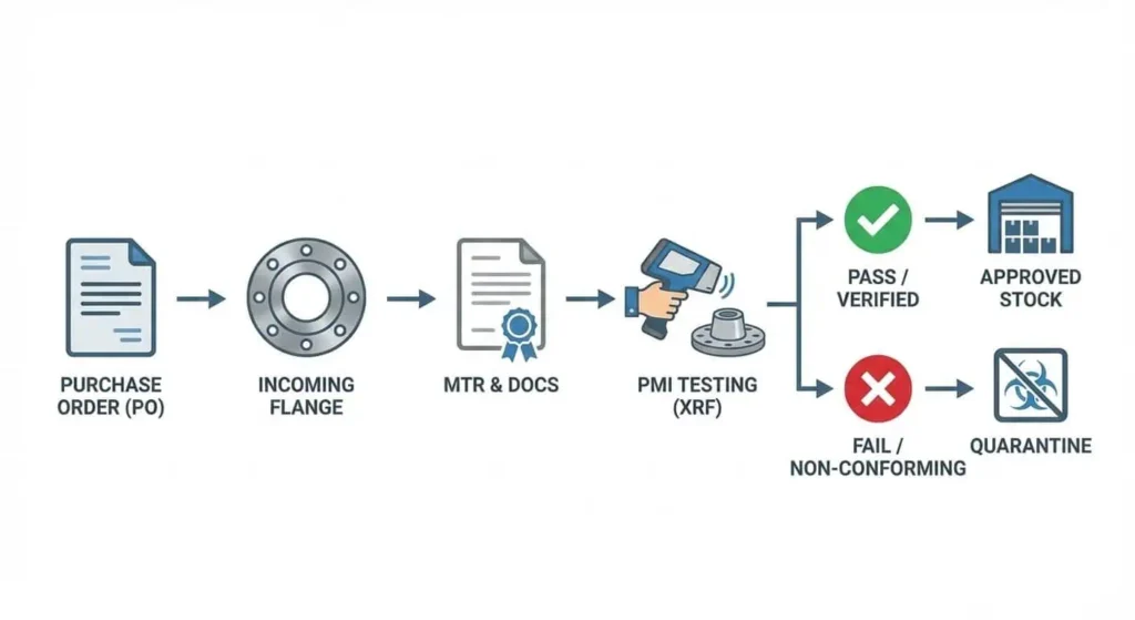Use a layered verification approach: review MTRs, confirm markings/traceability, perform receiving inspection, and apply PMI testing for critical materials or high-consequence services. For sour or special materials, also verify applicable hardness/heat treatment records and project-specific compliance documents.