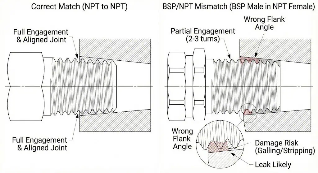 Incluso cuando un accesorio parece empezar a roscar, la falta de coincidencia en el ángulo y a menudo en el paso conduce a un enganche parcial, fugas y daños en la rosca (especialmente en acero inoxidable). Si debes hacer una transición, utiliza un adaptador diseñado (BSP↔NPT) y sella cada lado usando el método correcto para ese lado (sello en cara vs práctica de sellante en rosca cónica).