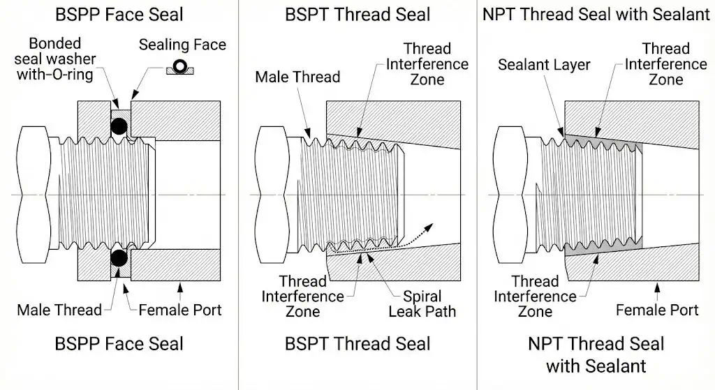 Las uniones NPT suelen utilizar interferencia de rosca y un sellante para bloquear la trayectoria de fuga en espiral. Las uniones BSPP suelen sellar en la cara (arandela/junta tórica/junta adherida). Las uniones BSPT sellan por interferencia de rosca cónica, y comúnmente se utiliza un medio de unión para la estanqueidad a presión y para reducir el riesgo de gripado.