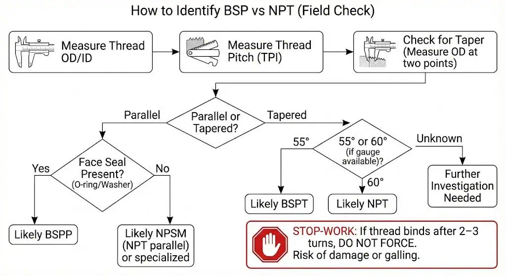 Consejo: Si una rosca “1/4” solo entra 2-3 vueltas y se detiene abruptamente, deténgase. Ese síntoma coincide con el comportamiento común de incompatibilidad entre BSP/NPT y generalmente termina en roscas dañadas.