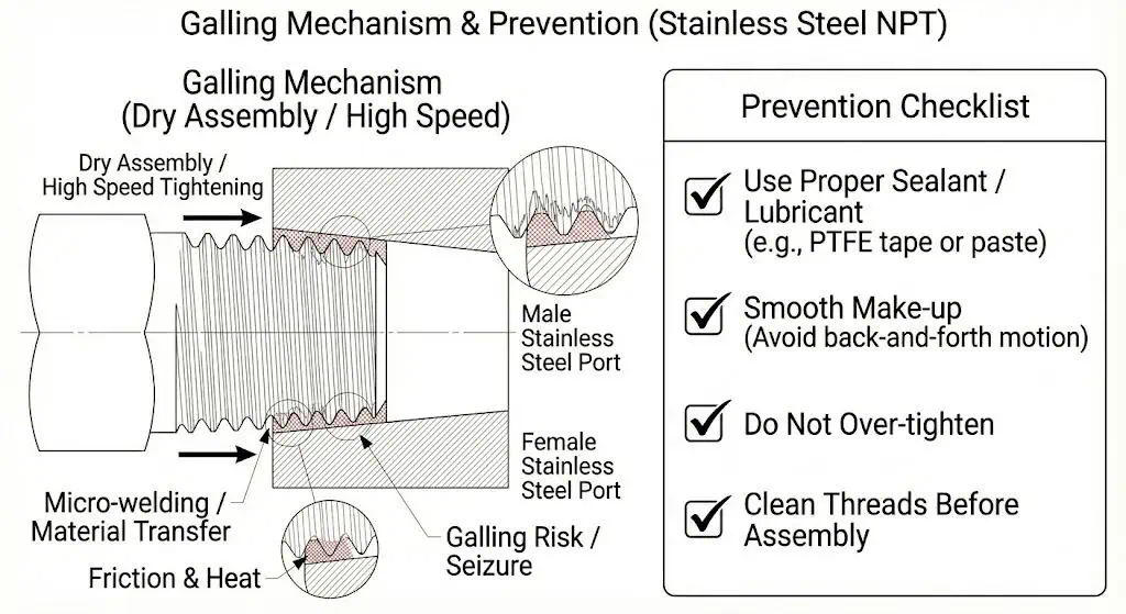 Los ángulos difieren y muchos tamaños difieren en el paso. Un síntoma común es “se aprieta solo un par de vueltas”, lo que parece progreso hasta que las roscas se dañan. Una vez que las roscas de acero inoxidable se agarrotan o deforman, el puerto puede ser chatarra.