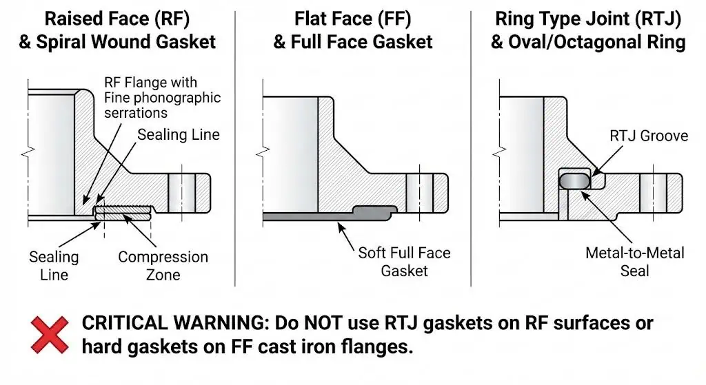 | Négliger la sélection appropriée du joint | Le type de surface (RF/FF/RTJ), le style de joint et le matériau de remplissage doivent correspondre au service. Une mentalité “ ça rentre dans le cercle de perçage ” provoque des fuites car la contrainte et le comportement d'écrasement du joint diffèrent. |