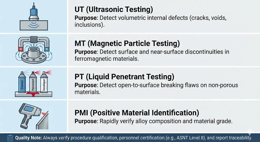 Lorsque vous approvisionnez de manière répétée, définissez des points de blocage où des inspecteurs tiers doivent assister ou vérifier (par exemple, PMI sur 100% de brides duplex, ou UT sur les zones d'épaisseur critiques). Cela garantit une qualité constante et vous aide à respecter votre date de livraison sans retouche surprise.