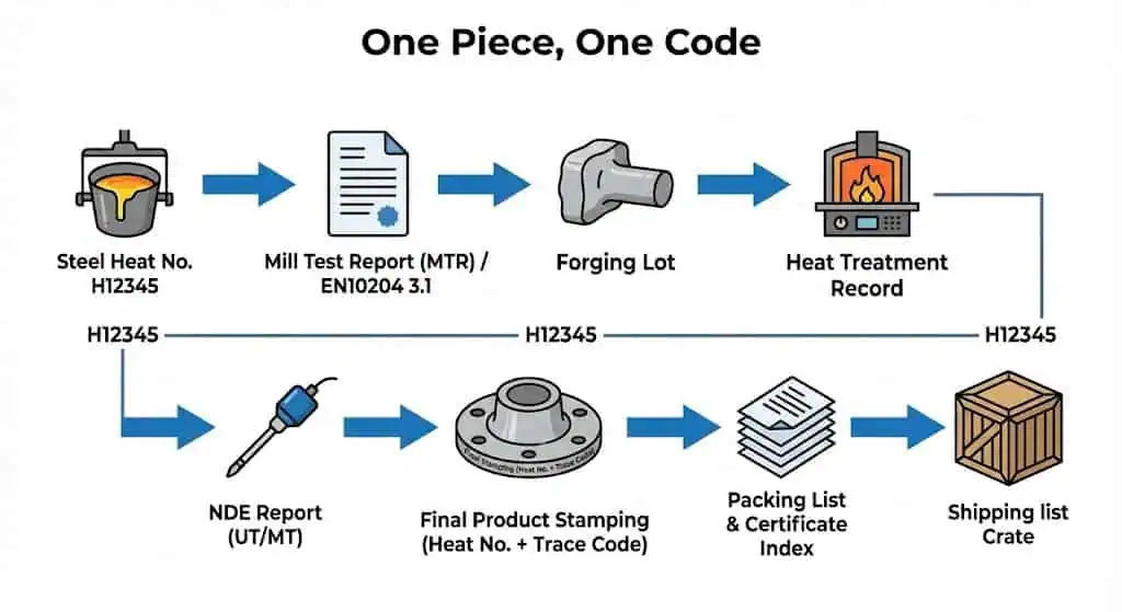 Les contrôles de processus doivent être visibles dans la documentation. Demandez une fiche de suivi (traveler) qui accompagne chaque bride à travers : réception de la matière première → forgeage → traitement thermique → usinage brut → END → usinage final → inspection finale → emballage. “ Nous le faisons toujours ” n'est pas une preuve ; une fiche de suivi tamponnée avec dates, validations opérateur/inspecteur et identifiants d'équipement est une preuve.
