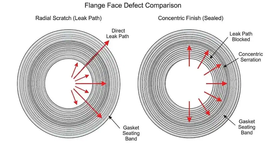 Per molte applicazioni con faccia rialzata ASME B16.5 che utilizzano guarnizioni a spirale, l'intervallo di finitura di magazzino comunemente citato è 125–250 µin Ra (circa 3–6 µm Ra). Ciò che conta di più nell'idrogeno non è la “lucidatura”, ma nessuna graffiatura radiale, nessuna ammaccatura e un modello di lavorazione uniforme. Una finitura smerigliata concentrica è spesso preferita quando si cerca di evitare canali di perdita “diretti”. Se la faccia presenta graffi radiali, non cercare di “risolvere con la coppia”—ri-lavorare o sostituire il raccordo.