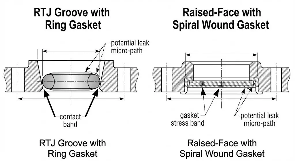 Il servizio con idrogeno comporta frequentemente cicli di pressione e effetti termici. Ciò significa che occorre (1) una guarnizione con sufficiente recupero e stabilità, e (2) un tipo di faccia della flangia e una finitura per cui la guarnizione è stata progettata. Per pressioni molto elevate, spesso si selezionano giunti RTJ perché la tenuta è metallo-metallo al contatto dell'anello. Per giunti a faccia rialzata, le guarnizioni a spirale con anelli di centraggio/interni corretti e un montaggio controllato possono funzionare bene quando il giunto è rigido e allineato.