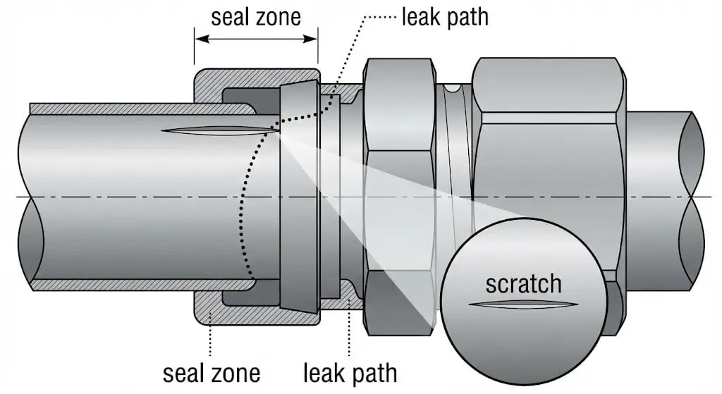 Caso de campo (vazamento na primeira pressurização): Uma linha de amostragem de nitrogênio apresentou um vazamento lento de bolhas após a montagem. A causa raiz foi um arranhão longitudinal superficial no OD exatamente onde o anel de vedação frontal veda. A correção foi cortar 25–40 mm até o tubo não danificado, re-preparar a extremidade e refazer o conector; a prevenção é proteger as extremidades do tubo durante o transporte e armazenar os comprimentos cortados com tampas.