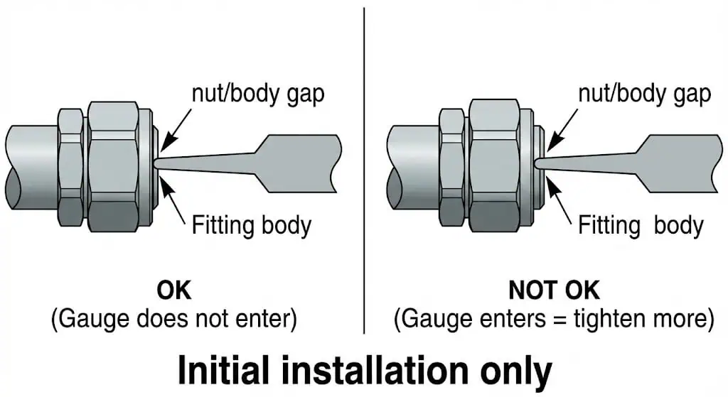 Para muitos acessórios, um calibrador de inspeção de folga é usado na instalação inicial para confirmar o aperto suficiente. Também verifique sua marca de posição da porca e que o tubo permaneceu totalmente assentado (marca de profundidade, se usada).