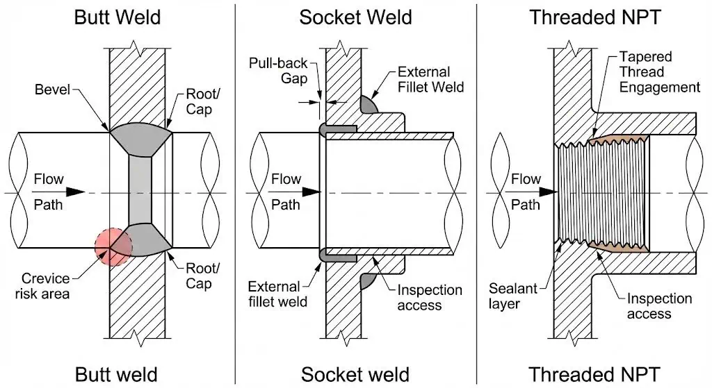 Геометрия сварки в раструб может удерживать отложения и создавать щели. Если среда содержит хлориды, застойная или склонна к образованию отложений, стыковая сварка или соединение, спроектированное для устранения щелей, часто проще обосновать. Если спецификация заказчика требует контроля соединения УЗК/РК, сварка в раструб часто плохо подходит.