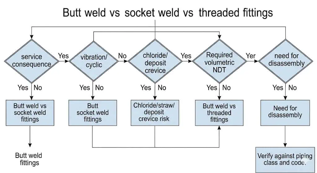Инженеры должны выбирать фитинги для трубопроводов со стыковой сваркой, сваркой в раструб или резьбовыми в зависимости от расчётного давления/температуры, циклических нагрузок, механизма коррозии, возможности контроля (НК) и доступа для обслуживания, определённых проектной спецификацией трубопроводного класса. Простое практическое правило: используйте стыковую сварку, когда требуется максимальная целостность и чистый проход; используйте сварку в раструб в основном для малых диаметров в высоконапорных технологических/приборных линиях, где обеспечен хороший контроль сборки; используйте резьбовое соединение там, где ожидается разборка, и условия эксплуатации действительно низкого риска. Всегда проверяйте окончательный выбор по применимому трубопроводному кодексу, спецификации заказчика и примечаниям к классу линии.