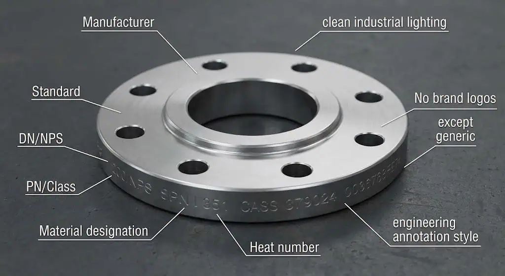 Точная маркировка фланцев и прослеживаемость обеспечивают безопасность, поддерживают аудиты и сокращают переделки. Инспекторы считывают маркировку, проверяя производителя, обозначение материала, семейство размеров, семейство классов давления, ссылку на стандарт и номер плавки — затем сверяя их с сертификатами и записями.