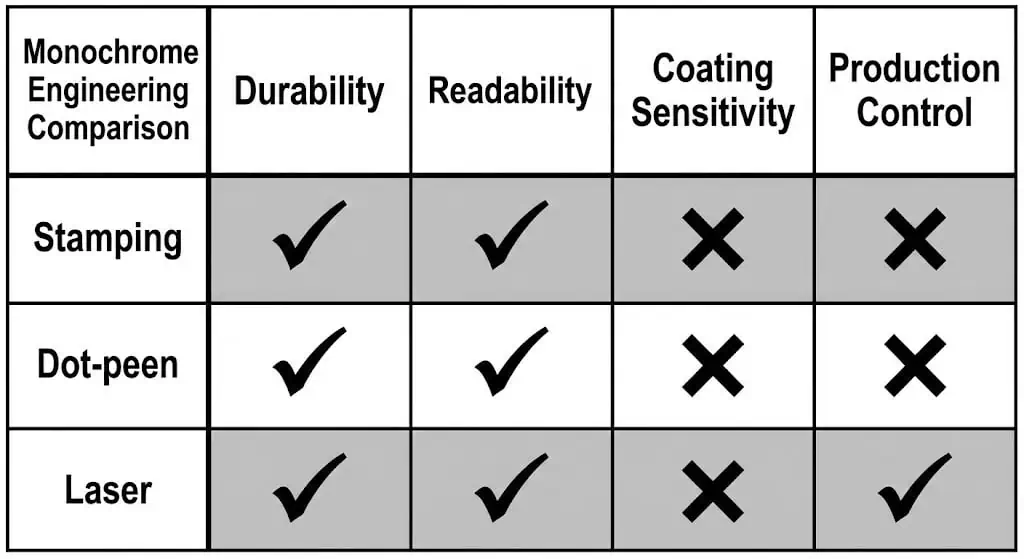 Глубокая штамповка, точечная маркировка и контролируемая лазерная маркировка могут быть долговечными при правильном применении; “лучший” метод — тот, который остается читаемым после вашей обработки и нанесения покрытия.