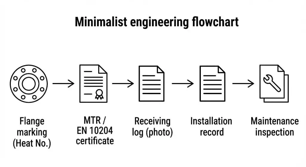 Пример на объекте: Партия фланцев поступила с читаемой маркировкой, но после пескоструйной обработки и нанесения грунтовки номер плавки стал нечитаемым. Экипаж не смог сопоставить сертификаты с физическими деталями во время сборки на болтах, поэтому линия была остановлена, фланцы помещены в карантин, и потребовались запасные части. Профилактика проста: проверять читаемость при приемке, фотографировать маркировку и защищать область клеймения при нанесении покрытия, если это позволяет план контроля качества.