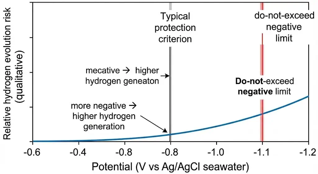 | Поляризованные потенциалы не должны быть чрезмерно отрицательными (например, не более отрицательными, чем примерно −1,10 В относительно Ag/AgCl для многих материалов) из-за повышенного риска водородного охрупчивания. Руководство по катодной защите ABS. | Чрезмерная защита увеличивает выделение водорода и повышает вероятность HISC/водородного охрупчивания в напряжённых зонах. |