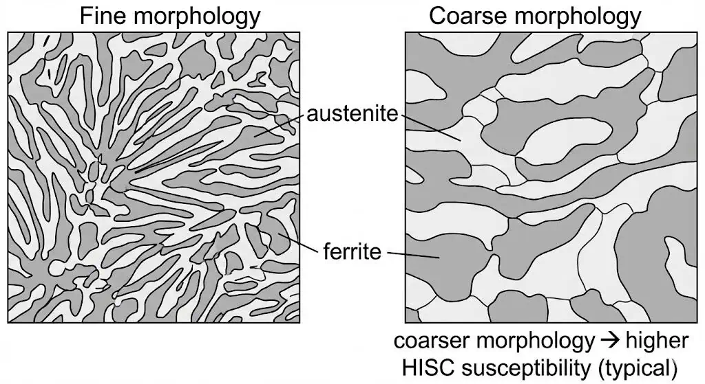 - Дуплексные и супердуплексные изделия, используемые в подводном оборудовании, подвергались отказам из-за HISC в эксплуатации; восприимчивость сильно коррелирует с микроструктурой, особенно с расстоянием между аустенитными зёрнами и морфологией “крупная vs. мелкая” в высоконапряжённых зонах. TWI опубликовал статью (HISC в подводных дуплексных компонентах).