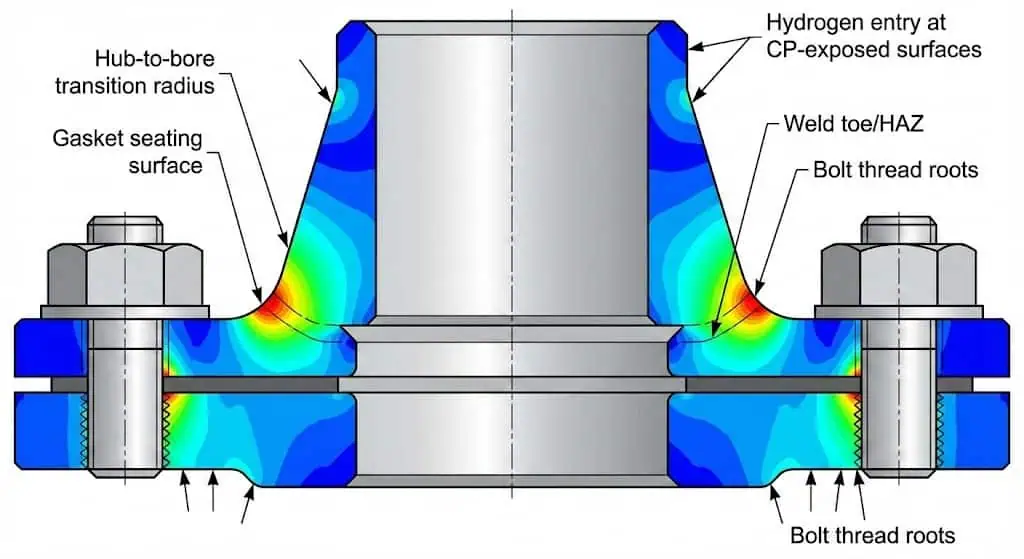 Подводные фланцы уязвимы, потому что они сочетают воздействие катодной защиты, сложную геометрию и высокие напряжения ограничения — часто сконцентрированные в переходе ступицы/отверстия и у сварных швов. Несколько факторов увеличивают вероятность инициации HISC: