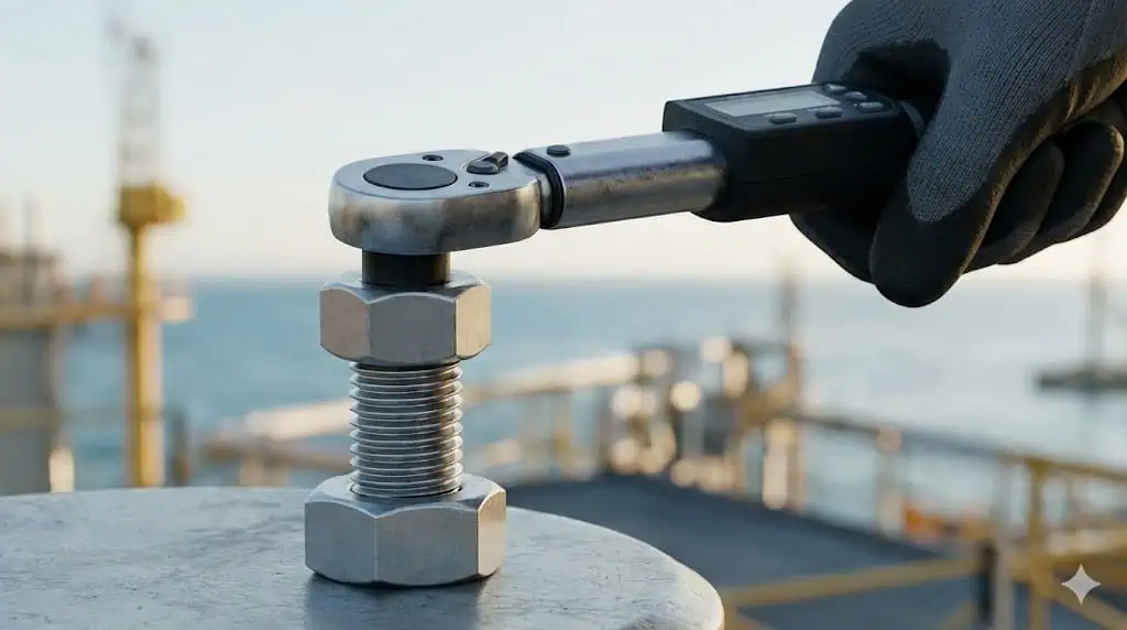 Техническое примечание (момент затяжки vs преднатяг): момент затяжки — это косвенный контроль. Практическая модель соотношения момент–преднатяг: T = K · F · d, где K (коэффициент трения гайки) сильно зависит от смазки и состояния поверхности. Для нержавеющей стали K может сильно колебаться; сухие сборки могут находиться в диапазоне ~0,25–0,35 , в то время как смазанные сборки могут быть ближе к ~0,15–0,22. Если преднатяг критичен для безопасности, проверьте усилие затяжки с помощью испытаний момент/усилие затяжки (см. ISO 16047).