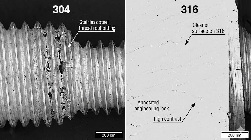 Преимущество 304 проявляется в стабильных условиях с низким содержанием хлоридов: он сохраняет прочность, поддерживает пассивную плёнку и остаётся экономичным. Его слабое место — именно то, что больше всего не любят монтажники: впадины резьбы + хлориды + циклическая нагрузка. Именно здесь точечная коррозия становится концентратором напряжений, локально возрастает касательное напряжение, и гайка начинает терять усилие затяжки.